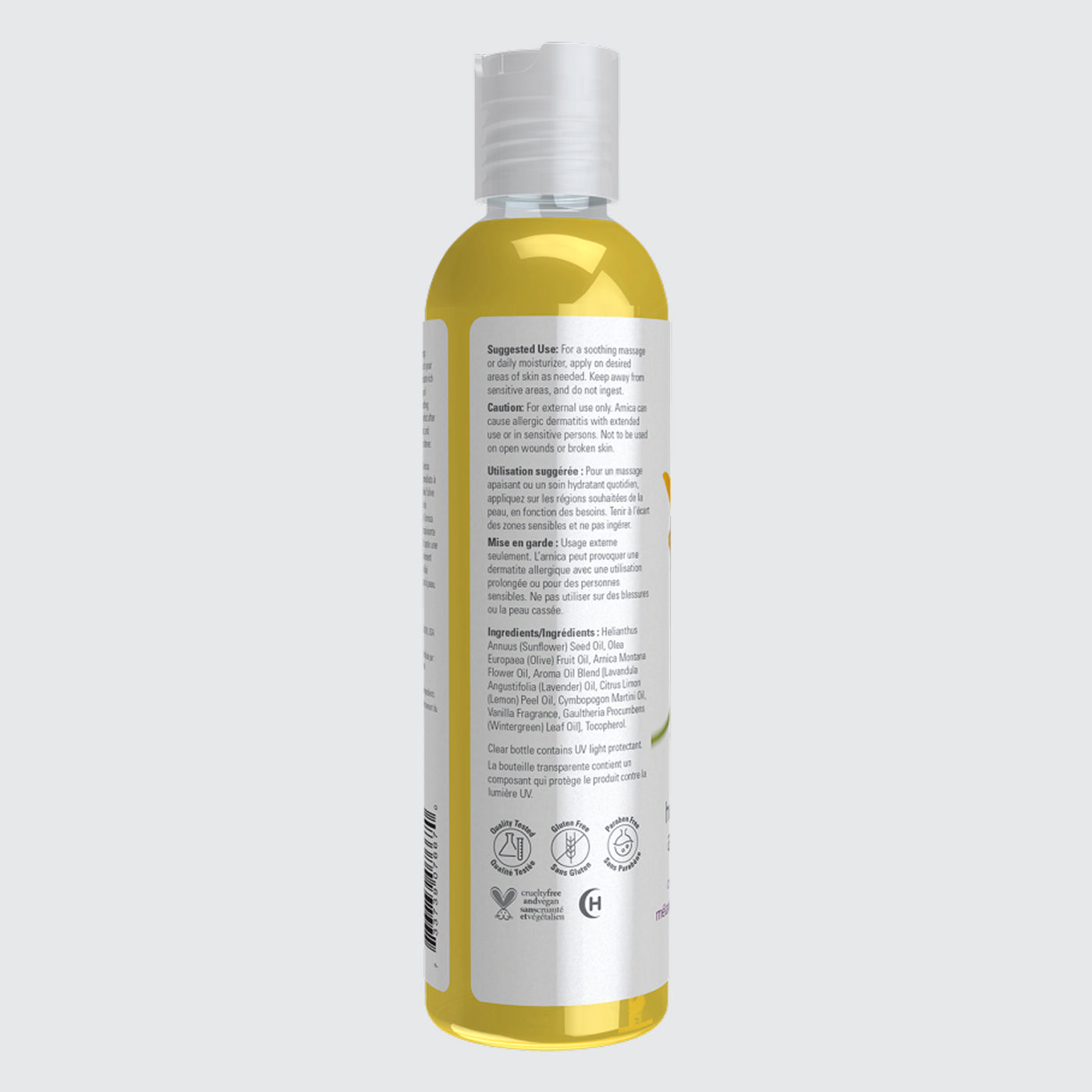 Ingredients:  Helianthus Annuus (Sunflower) Seed Oil, Olea Europaea (Olive) Fruit Oil, Arnica Montana Flower Oil, Aroma Oil Blend [Lavandula Angustifolia (Lavender) Oil, Citrus Limon (Lemon) Peel Oil, Cymbopogon Martini Oil, Vanilla Fragrance, Gaultheria Procumbens (Wintergreen) Leaf Oil], Tocopherol.