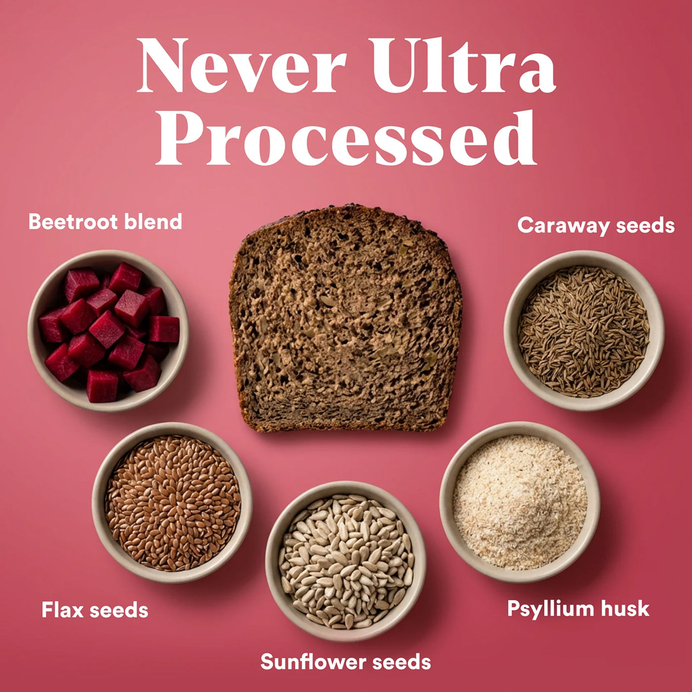 Unlike many low carb breads, we never use additives, thickeners or emulsifiers and stay away from added gluten and eggs. Instead, we use natural, plant based ingredients such as flaxseeds, sunflower seeds and psyllium husk to bind the bread together.