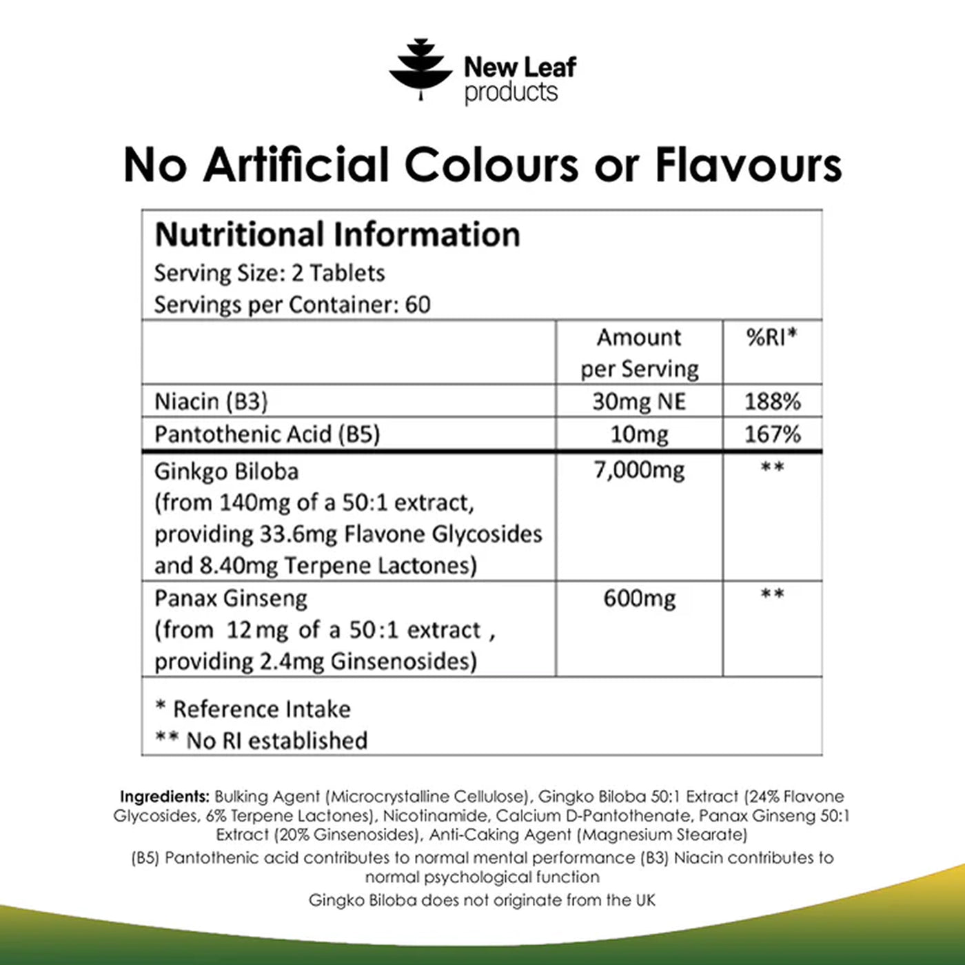 The combination of Ginkgo Biloba and Korean Ginseng, creates a foundation for well-being. The inclusion of Terpene Lactones and Flavone Glycosides (active compounds found in Ginkgo extracts), acting as antioxidents compounds recognized for their impact on cognitive health, along with the energizing effects of Vitamins B3 and B5, embodies New Leaf's commitment to blending traditional ingredients with scientific insight for optimal health.