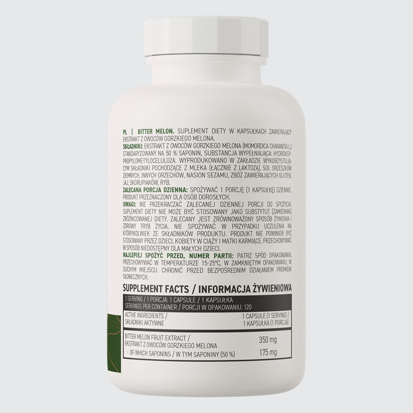 • Source of valuable extract - one serving of the dietary supplement provides the body with 350 mg of bitter melon extract standardized to 50% saponins.