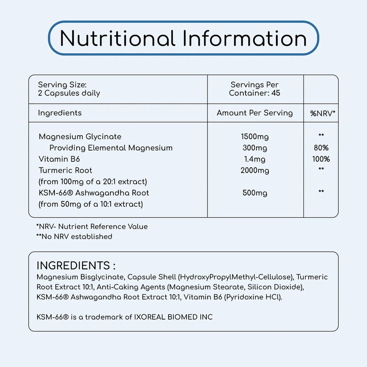 These capsules combine highly absorbable magnesium glycate with B6 turmeric, and KSM-66® Ashwagandha to support your body and mind. Magnesium glycinate promotes muscle relaxation, reduces cramps, and improves sleep quality, while Vitamin B6 boosts energy metabolism and helps maintain a balanced mood. Turmeric provides natural anti-inflammatory and antioxidant support for joints and heart health, and KSM-66® Ashwagandha helps the body adapt to stress while enhancing mental clarity.