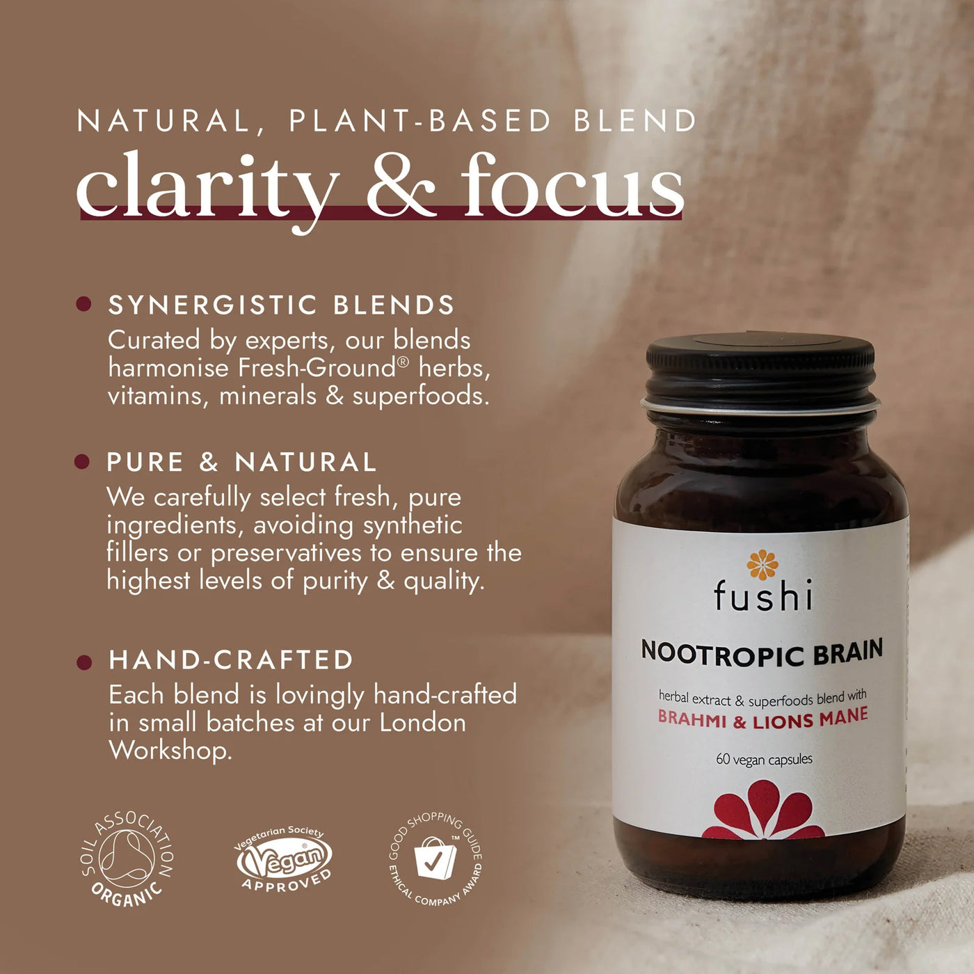 • With Fresh-Ground® high-strength KSM-66 Ashwagandha, Brahmi, Lions Mane, Matcha & Gotu Kola herbs.