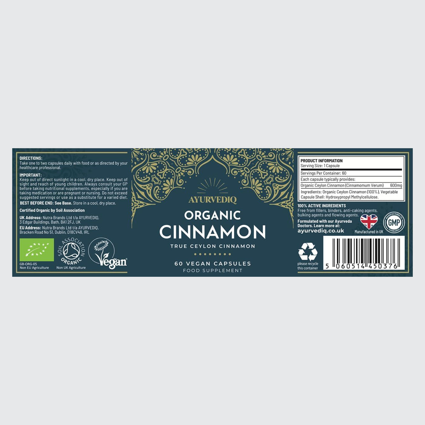 • CERTIFIED ORGANIC CINNAMON – Ayurvediq Organic Cinnamon capsules deliver 600mg of Soil Association certified Organic Ceylon Cinnamon per serving, in 60 vegan capsules for pure, trusted daily support your body can enjoy.