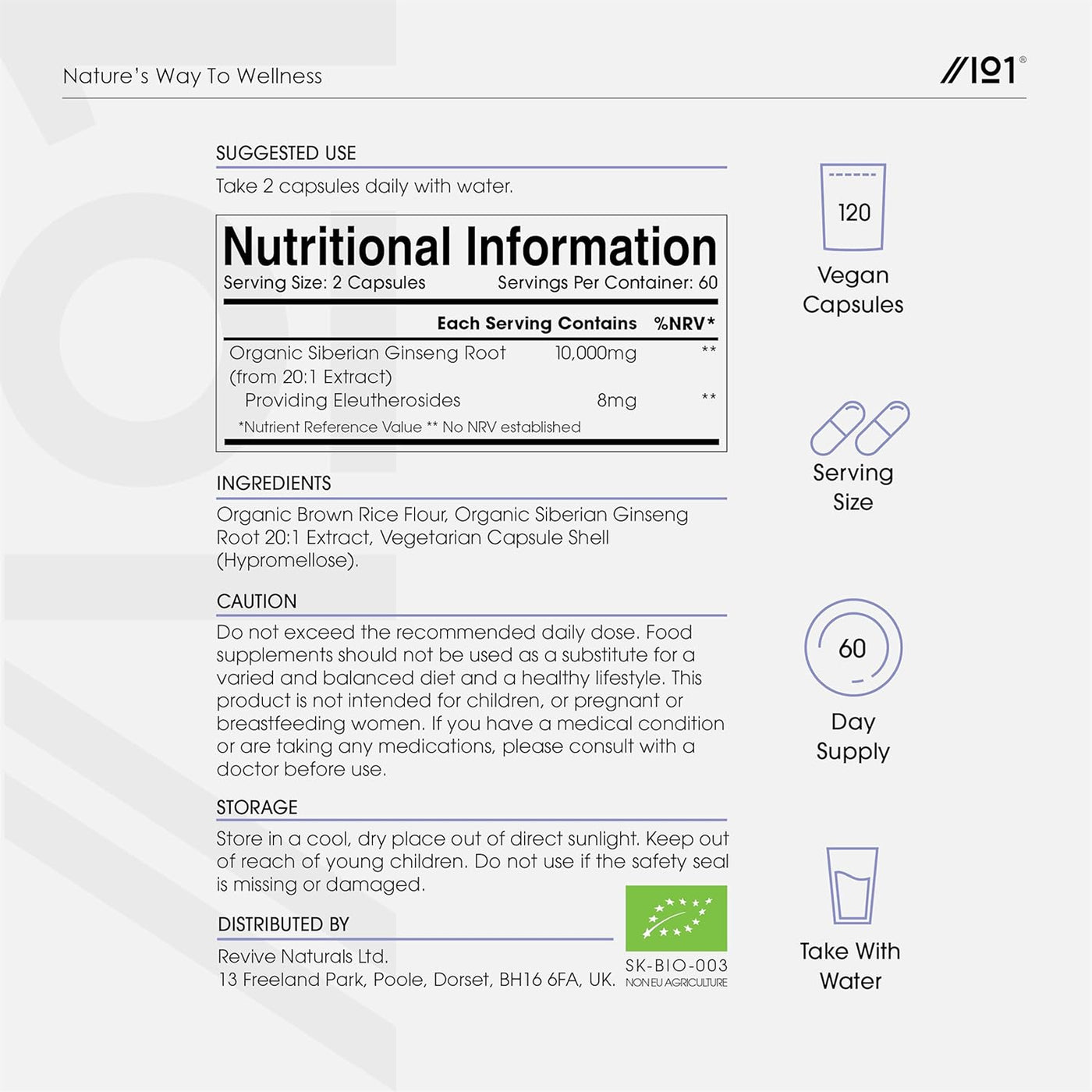 Ingredients: Organic Brown Rice Flour, Organic Siberian Ginseng Root 20:1 Extract, Vegetarian Capsule Shell (Hypromellose)