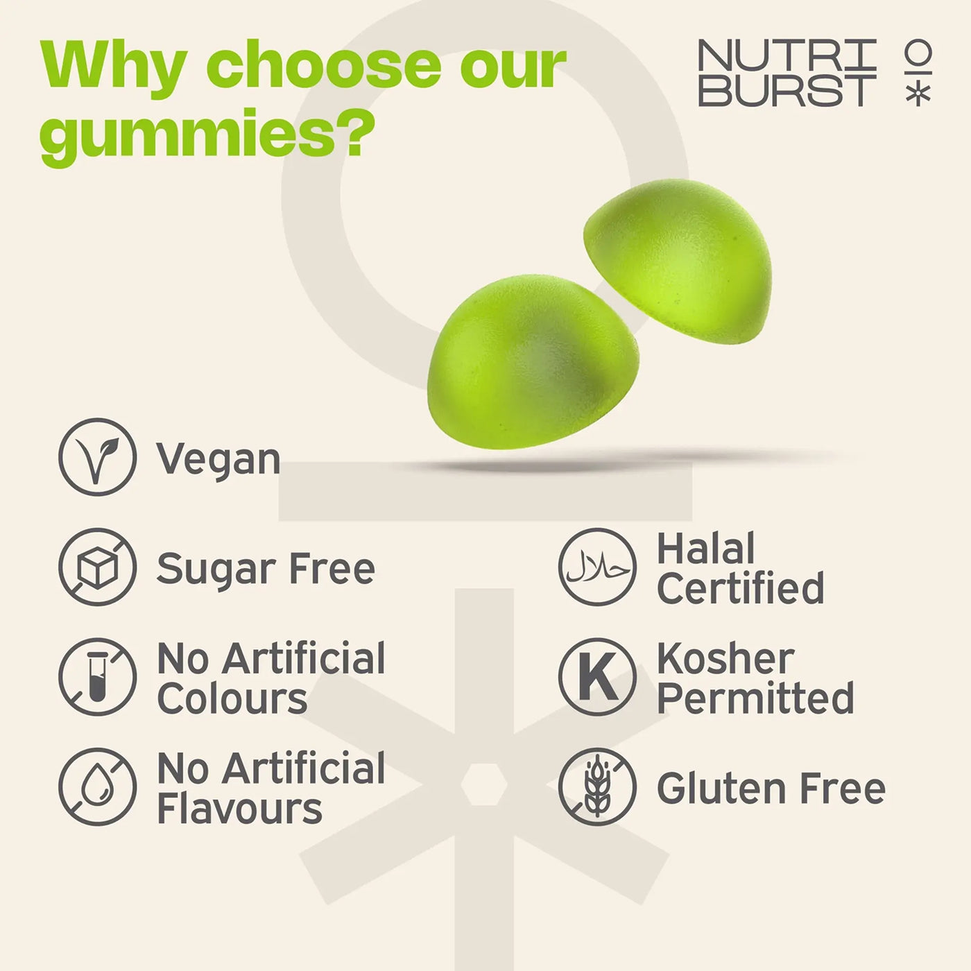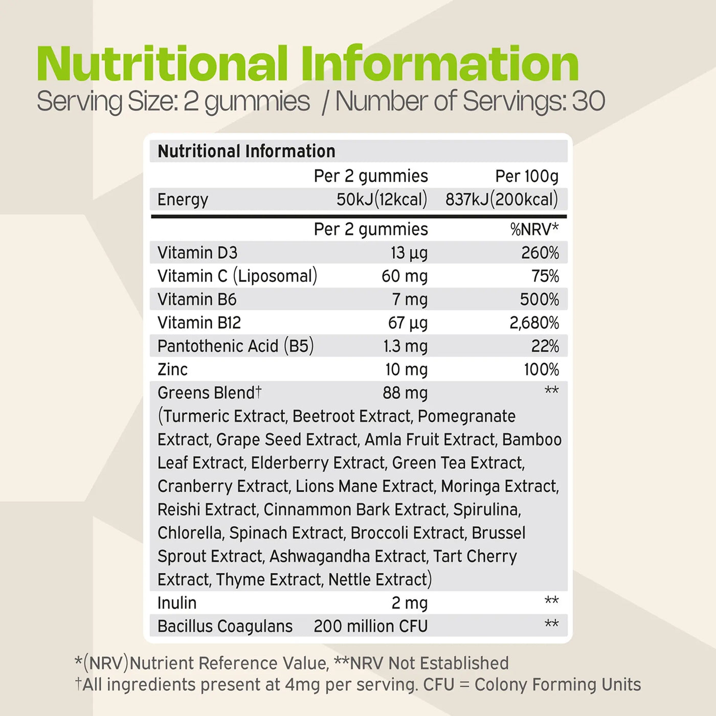 Sweeteners (Maltitol, lsomalt), Water, Gelling Agent (Pectin), Acidity Regulators (Citric Acid, Sodium Citrate), Liposomal Vitamin C (Vegetable Oil, Cocoa Butter, Isomaltose Syrup, Buffer Salt, Ascorbic Acid), Natural Flavour, Zinc Citrate, Vitamin D3 (Cholecalciferol), Pyridoxine HCl, Turmeric Extract, Beetroot Extract, Pomegranate Extract, Grape Seed Extract, Amla Fruit Extract, Bamboo Leaf Extract, Elderberry Extract, Green Tea Extract, Cranberry Extract, Lions Mane Extract (Fruiting Body), Moringa Extract, Reishi Extract (Fruiting Body)Cinnammon Bark Extract, Spirulina, Chlorella, Spinach Extract, Broccoli Extract, Brussel Sprout Extract, Ashwagandha Extract, Tart Cherry Extract, Thyme Extract, Nettle Extract, Inulin, Bacillus Coagulans, Calcium D-Pantothenate, Colouring Food (Apple Extract), Vegetable Oil (Coconut Oil, Glazing Agent [Carnauba Wax]), Vitamin B12 (Methylcobalamin), Sweetener (Steviol Glycosides from Stevia)