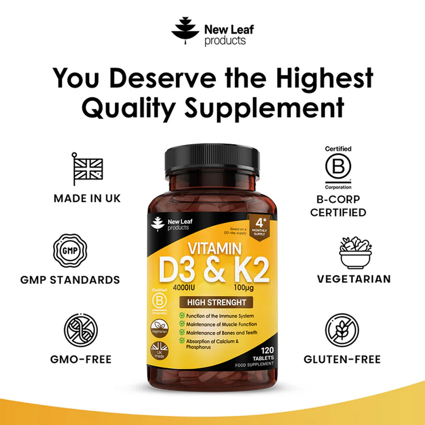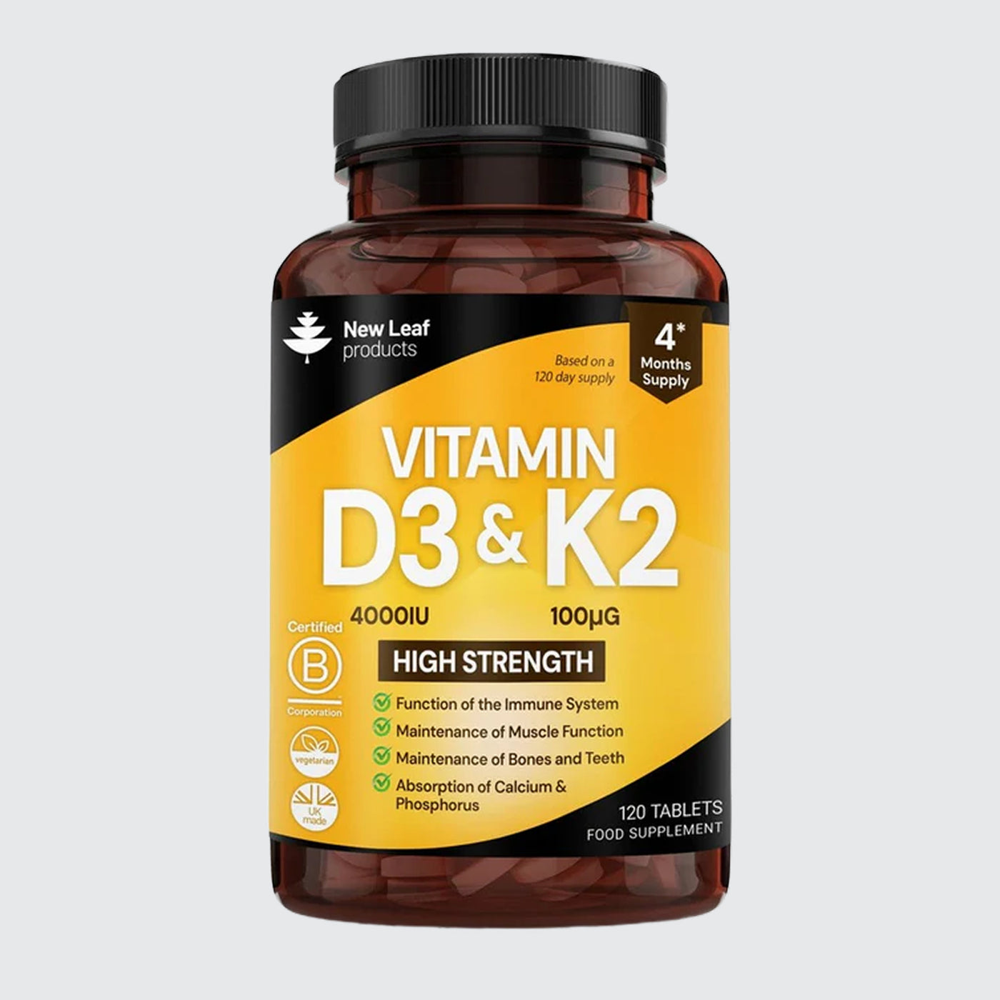 Each serving of tablet provides 4000iu of D3 and 100mcg of K2 vitamin. Each bottle of vitamin D K2 contains 120 tablets of vitamin D3 and K2 that will last for 4 months.